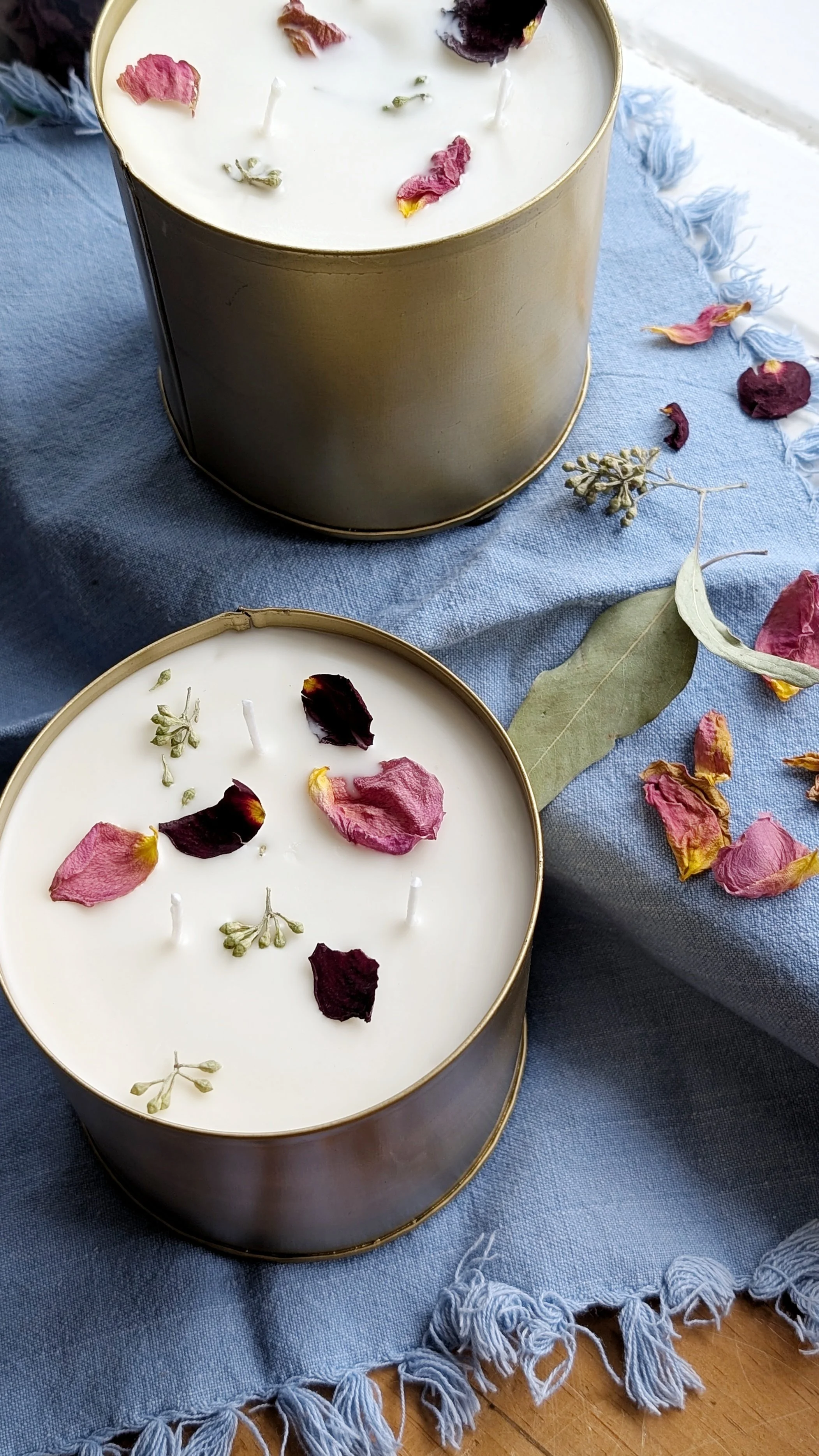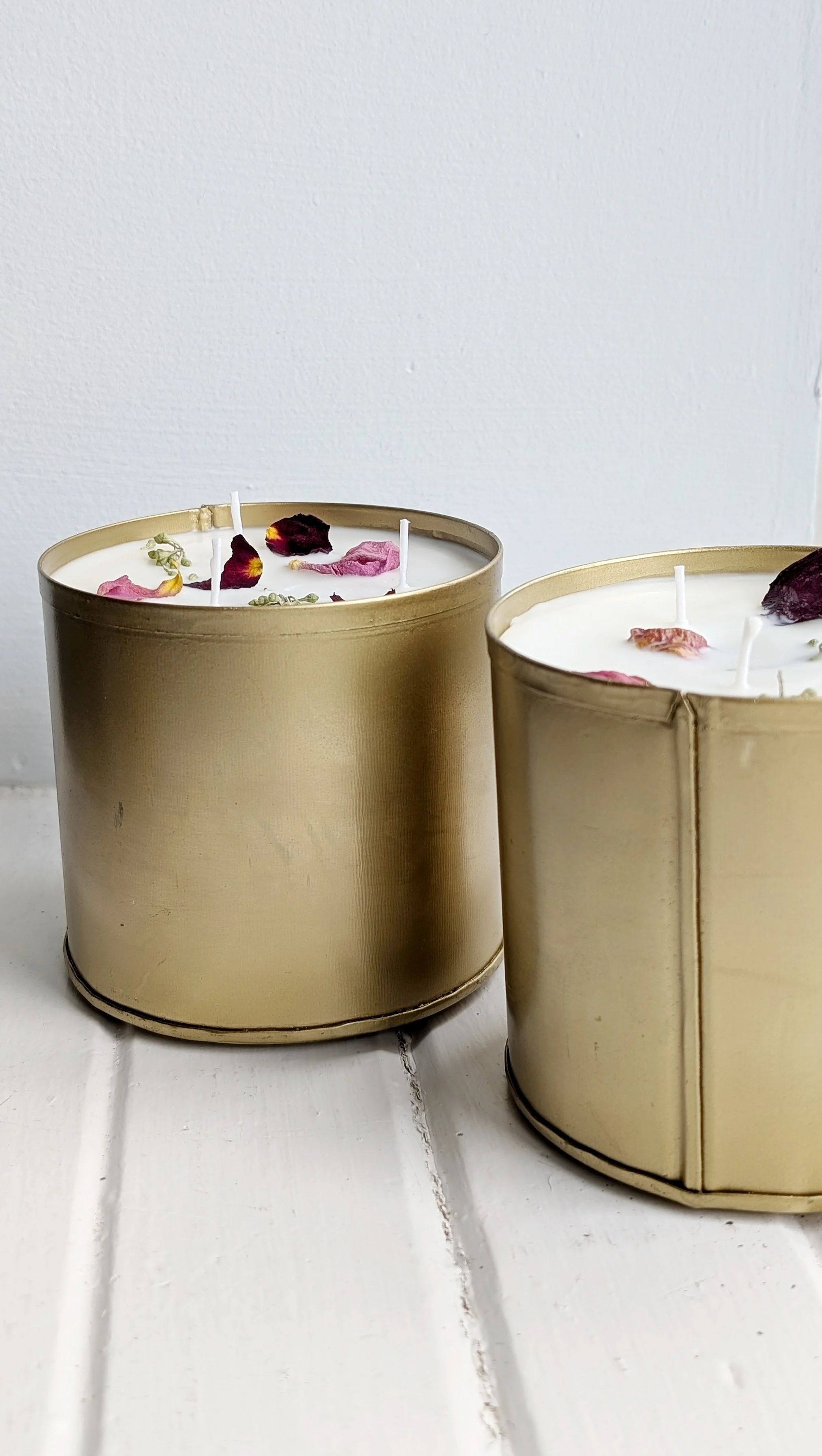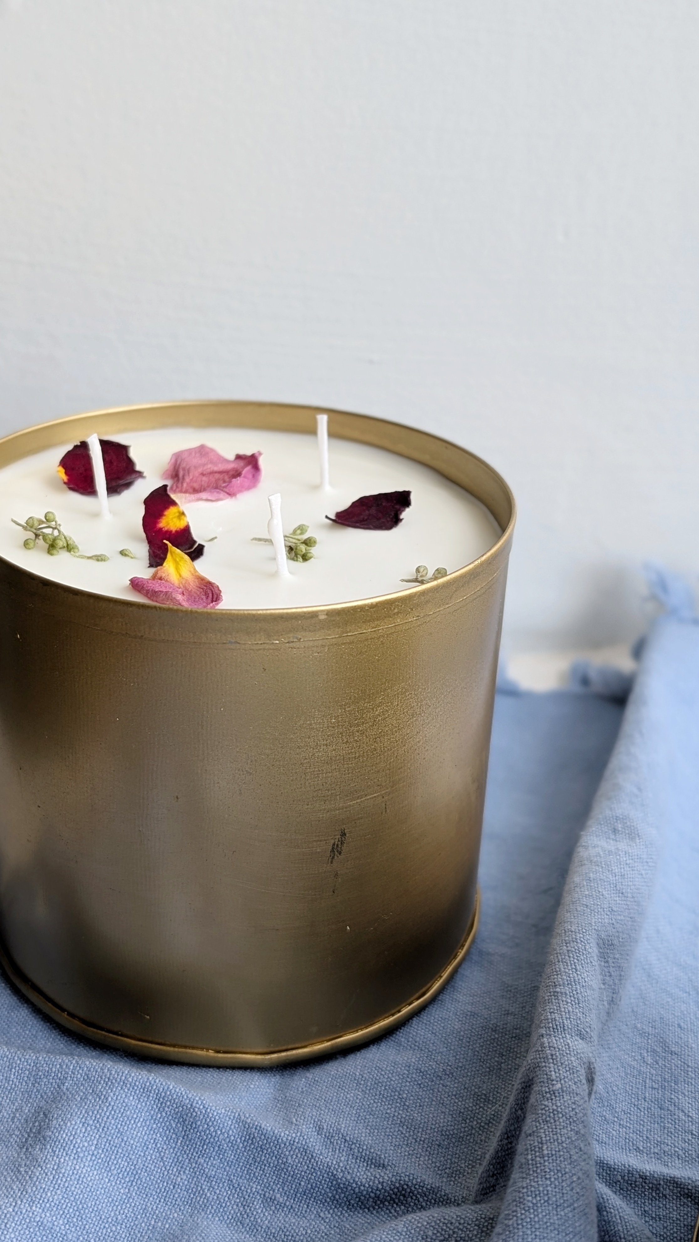 This triple wick candle is poured with 32oz of soy wax and scented with custom-made oils in a gold metal vessel.